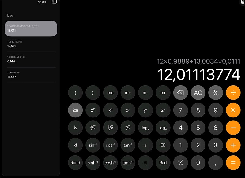 Det är nog jag som slår något helt fel, skrev in exakt samma på min miniräknare och fick samma svar som du ser på skärmdumpen (12,0111…)