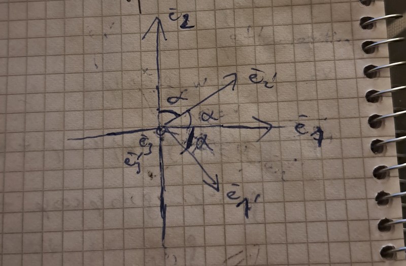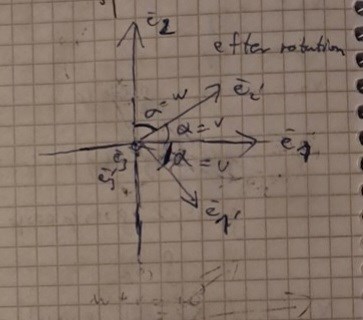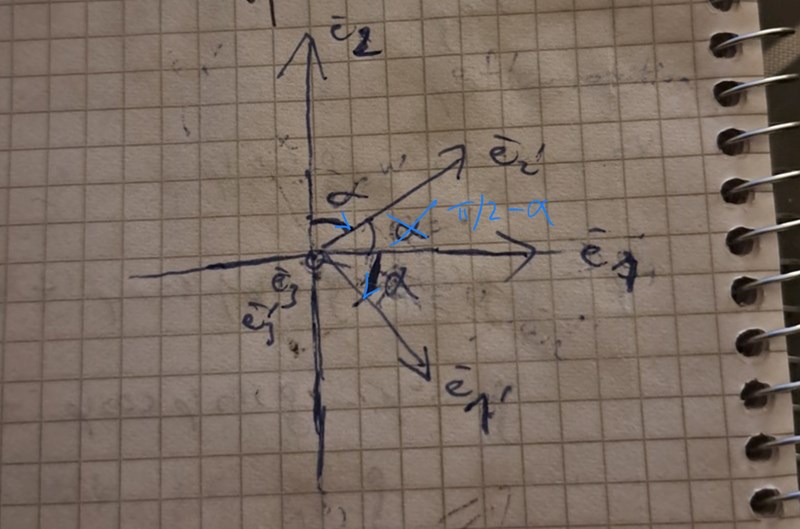 Jag förstod som att man ska hela tiden vrida e_1' , e_2' och e_3' kring e_3 med en vinkel. Före rotationen ser de ut såhär och efter vridningen ser de ut såhär (andra bilden). Enhetsvektorerna i det oprimmade system är ortogonala mot varandra och i det primmade system är de också ortogonala mot varandra. Jag tolkar som att de primmade enhetsvektorerna inte var vridna i min första bild.