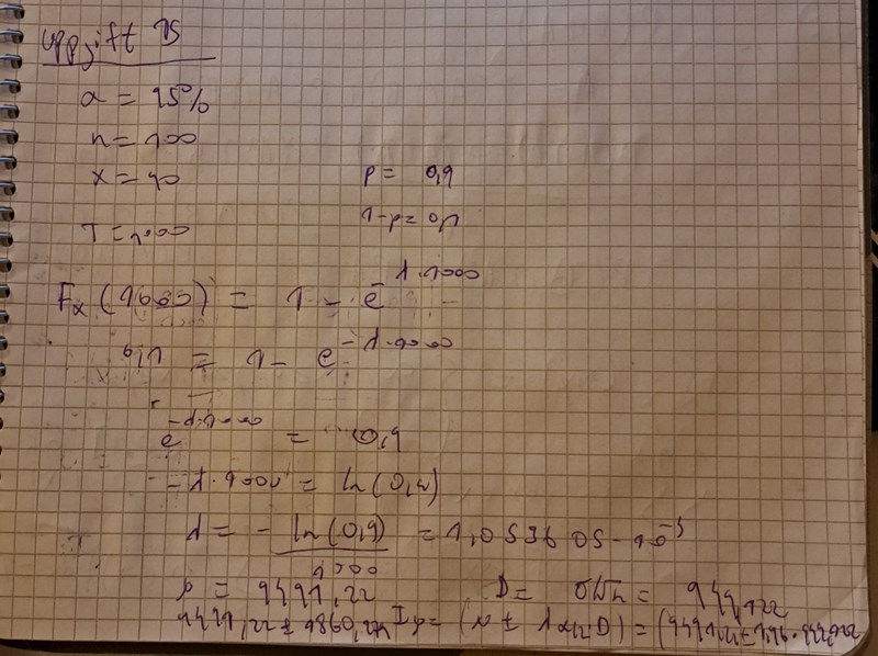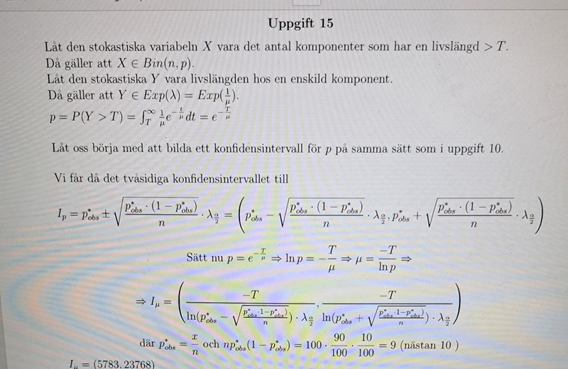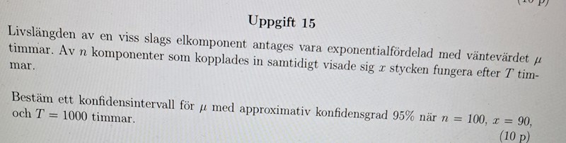 Alltså x=90 ( en del st av lamporna vi observerar som funkar) och n=100(antalet elkomponenter tex lampor vi observerar). Vi observerar livslängden hos elkomponenten efter T timmar.