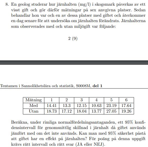 Hej! Jag försökte lösa denna uppigt och fick ett konfidensintervall som var nära facits intervall. Det verkar som jag använt rätt metod men får ändå inte exakt lika intervall:( Sedan har de svarat ja att man kan påstå att giftet har effekt på järnhalten medan jag fick fram att man inte kan det. vet inte riktigt hur de gjort för att komma fram till detta?