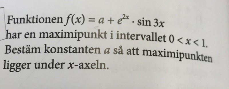 Smaragdalena skrev:Börja med att derivera funktionen och undersök vilket x-värde i intervallet som ger en maximipunkt.