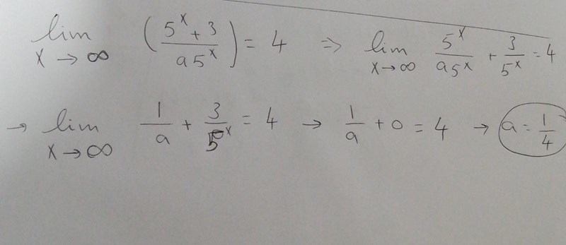 Bra, då gäller mitt första tips (det jag strök över i första svaret), dvs förkorta bråket med 5x och se vad som händer då x går mot oändligheten.