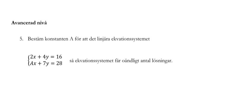 Frågan är "Bestäm konstanten A för att det linjära ekvationssystemet så att ekvationssystemet får oändligt antal lösningar."