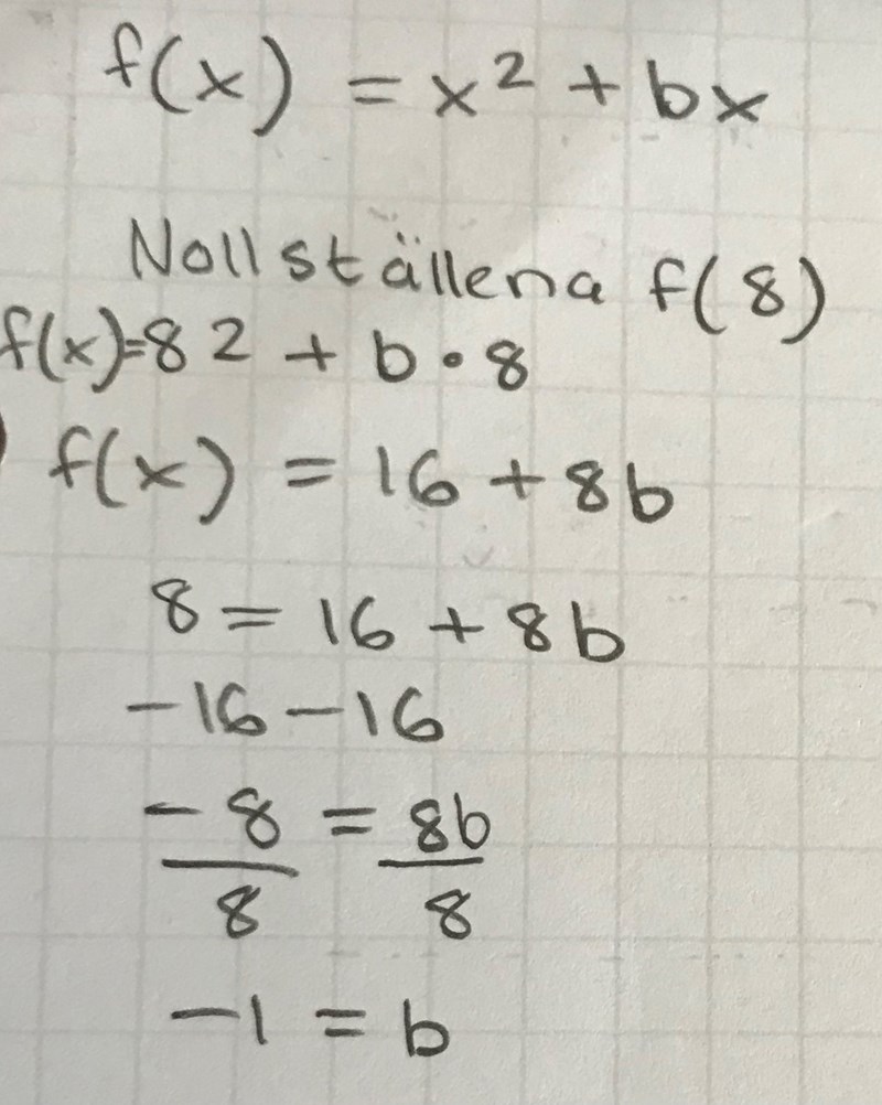 Jag försökte lösa denna uppgift, men kom fram till fel svar på uppgift f, då svaret på uppgiften ska vara b = -4 men jag får ju något helt annat. Skulle uppskatta om någon kunde ta en titt på min beräkning!