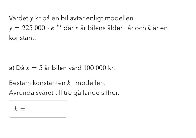 Eftersom du har ett x-värde och ett y-värde kan du sätta i dem i formeln och på så sätt bara ha en okänd variabel: k.