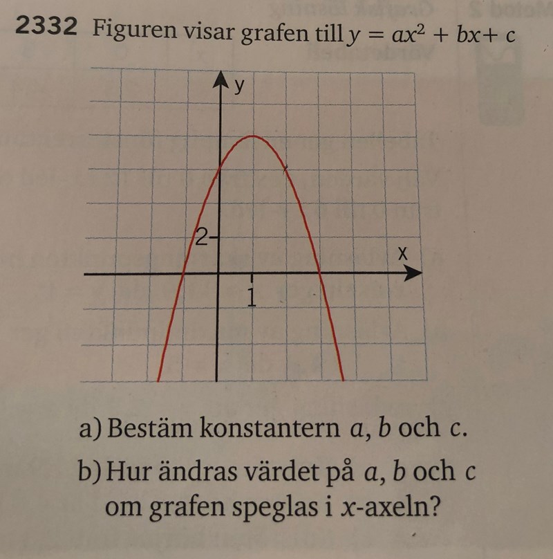 3. Du kan välja två punkter på grafen och sätta in dem i sambandet y=ax2+bx+cy=ax^2+bx+c, vilket ger dig ett ekvationssystem med två ekvationer och två obekanta aa och bb.