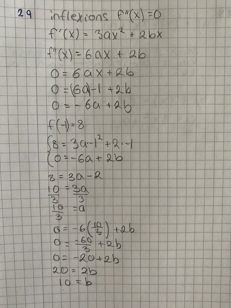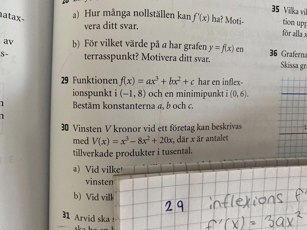 funktionen kommer ha en inflexionspunkt där andraderivatan är 0, därför beräknade jag andraderivatan och satte den lika med 0. Sen blev jag osäker, men tänkte att man kanske kunde hitta y värdet där första derivatan är lika med 8. Detta ger mig dock fel svar. Hur kan jag tänka istället?