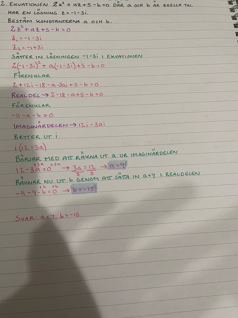 Kontrollera att lösningarna då blir z1 = -1-3i och z2 = -1+3i.