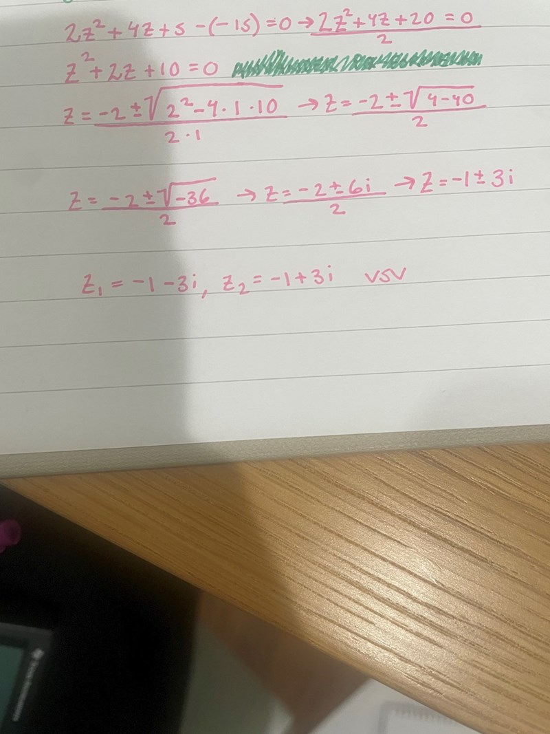 Ah, faktorn efter 2 ska vara kvadrerad, alltså 2(-1-3i)2. Och sedan ska b=-15 enligt ekvationen vara positiv då -b.