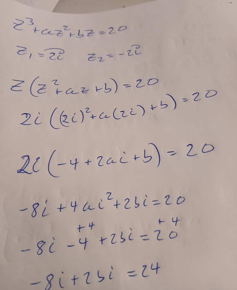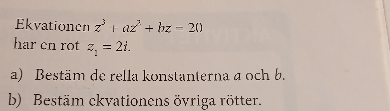 Utnyttja också den andra roten z=-2i som du kom fram till, så får du ett ekv system i a och b att lösa.