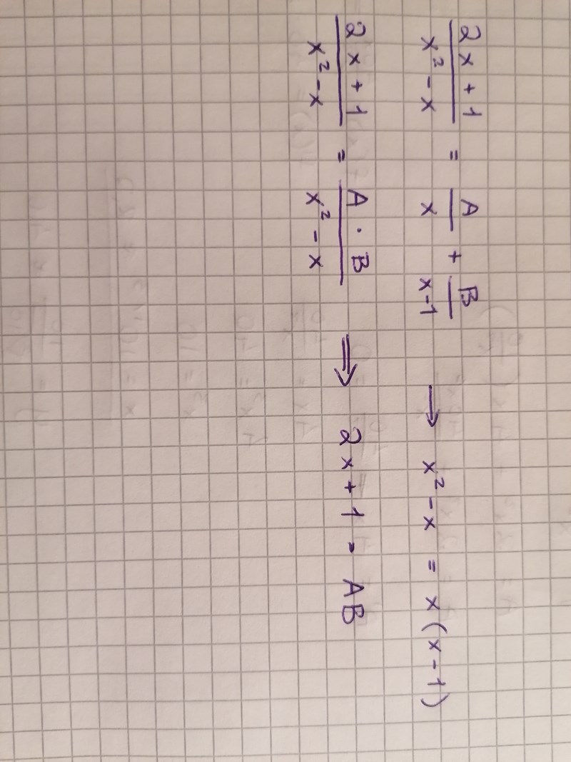 Bestäm konstanterna A och B så att (2x+1)/(x^2-x)=(A/x)+(B)/(x-1) för alla x, där x inte är lika med 0 och 1.