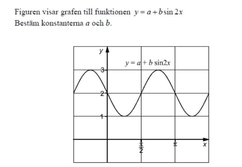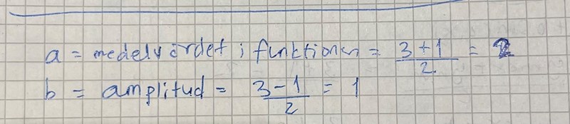 Varför är b fel? Ska man inte ta (ymax - ymin)/2? Jag ser i grafen att b=2 men varför är det fel att använda formeln på det sättet som jag gjorde? Varför är det fel att ta (3-1)/2= 1?