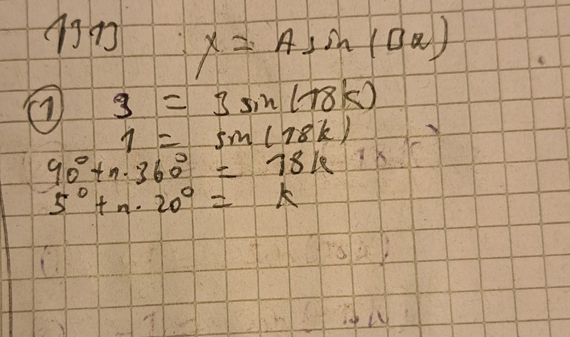 Jaha ok. Men nu var det så att vi skulle lösa den där ekvationen 3=3sin(18k) if you remember. Då fick jag ju som jag skrev. enligt facit är B=5 så basically B är egentligen k eftersom det står Asin(Bx). då kanske jag ej skulle skriva 90 grader och lägga tilll en period utan bara skriva 90=18k ,k=5