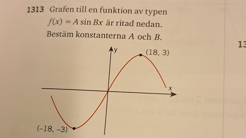 Här var det ganska enkelt att hitta amplituden. Men för att hitta B så vet jag ej hur man gör. Jag försökte använda sambandet Perioden=360/k och tänkte x =18 är k men det kanske ej är så man ska tänka