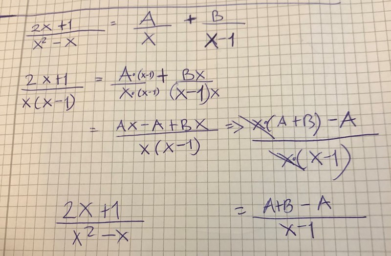 Därefter skriver du om täljaren så att den har en x-term och en konstant term (uttryckt i A och B)