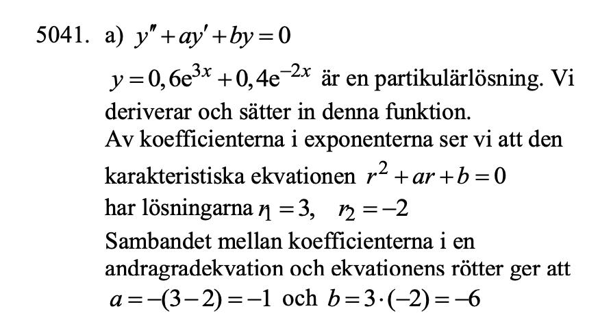 Jag förstår inte lösningsförslaget, förstår hur r1 och r2 beräknas däremot förstår jag inte varför man har ställt upp ekvationen a = -(r1+r2) och b = 3*(-2)