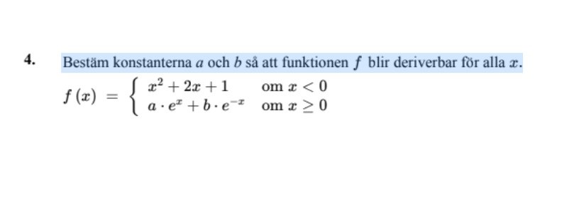 Bestäm konstanterna a och b så att funktionen f blir deriverbar för alla x.