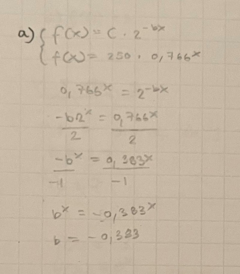 Jag håller på med denna uppgift som du kan se nedan. Nedan kan du även se hur jag har löst den. Problemet är att svaret ska bli positivt men mitt blev negativt (med självaste ”talet” var korrekt), så jag undrar vad jag gör för fel? Jag undrar även hur man ska lösa den hör uppgiften på rätt sätt istället? I facit så stod det att dem dividerade ln 0,766 med ln 2, men hur kan dem göra så?