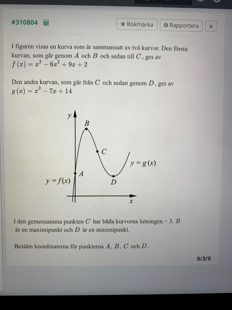 För punkten C har både f(x) och g(x) derivatan lika med -3. Då g(x) är en andragradsfunktion medan f(x) är en tredjegradsfunktion skulle jag derivera g(x) och söka det x-värde där derivatan är -3.