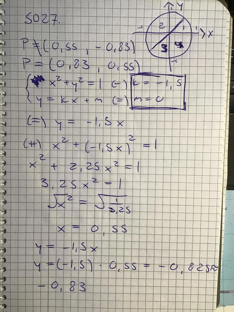 som vi sätter in i x2 + y2 = 1. Då trillar x = 0,83 ut.