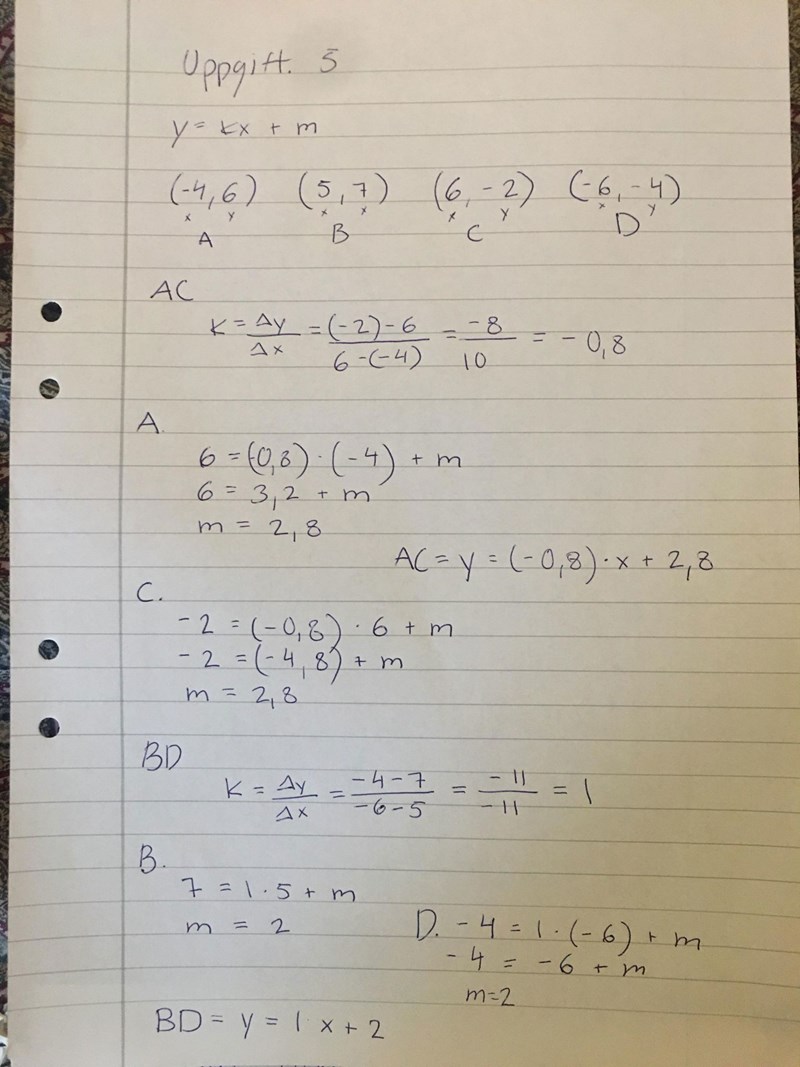 CamillaT skrev:Jag har inte gått igenom din uträkning. Men ett sätt att kolla om lösningen verkar rimlig är att rita fyrhörningen och dess diagonaler och se om skärningspunkten verkar stämma med det du räknar fram. Även om du inte kan få fram ett exakt värde när du ritar så ser du ändå om det verkar vara rimligt.
