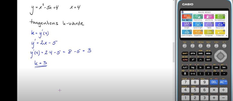 Om , så blir derivatan (eller hur?). Derivatan är en funktion som räknar ut lutningen i en punkt, dvs. man sätter in ett x och det man får tillbaka är k-värdet på tangenten till den punkten. Eftersom vi vet att det k-värdet ska vara 6, kan vi sätta dom lika: