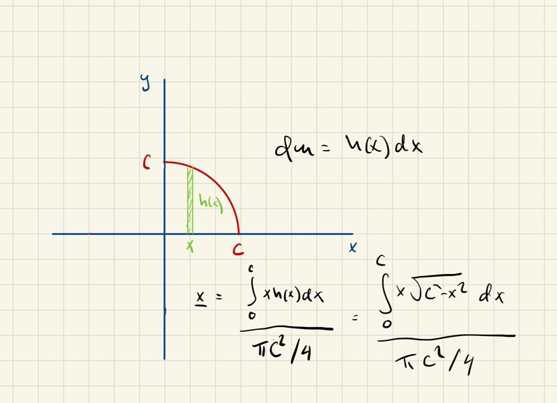 Jag genomförde beräkningen och fick x =(4c)/(3pi) vilket jag är rätt så säker på är rätt för att en föreläsare på Youtube fick också det svaret. Fast han hade satt bredden på rektangeln till dx istället för x. Är det någon skillnad?