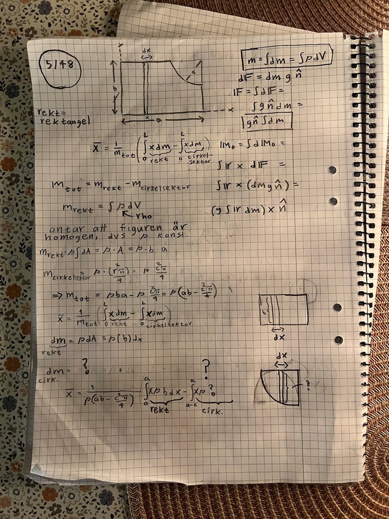 På föreläsningen har vi gått igenom formeln för att beräkna tyngdpunkt och så ett knep för att beräkna tyngdpunkten om man har en figur som i den här uppgiften, när figuren vars tyngdpunkt man ska beräkna har något "utskuret från sig".