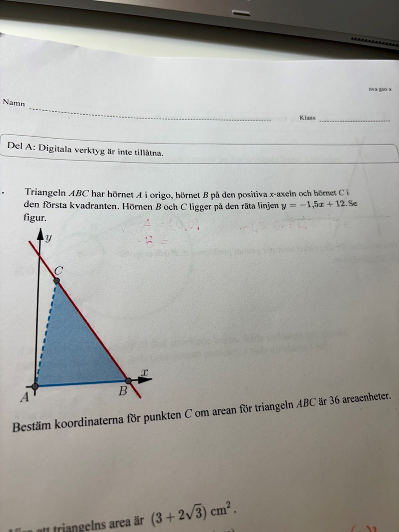 Arean på traingeln är given i uppgiften, och är (b * h)/2. Y-värdet för punkt C är höjden, och har du y-värdet på den punkten kan du lösa ut x-värdet.