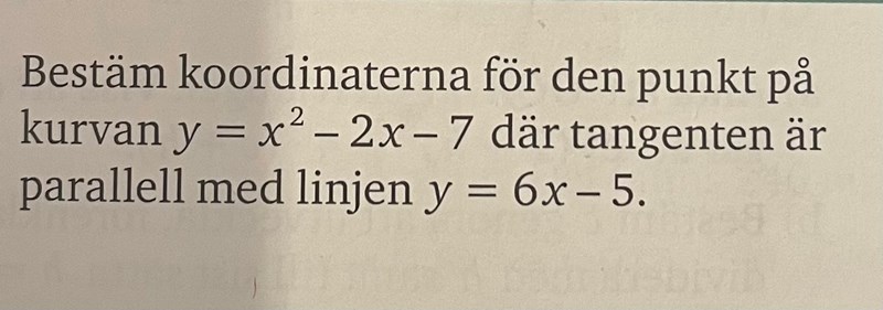 Det jag har gjort är ju att derivera både kurvan och linjen. När jag deriverade linjen fick jag att k = 6 och då tänkte jag att kurvan och linjen är parallela så därför satte jag in 6 som y i kurvans ekvation så att det blev 6 = 2x (-2 är 0 vid deriveringen) och då fick jag fram att x = 3. Sen så satte jag in x = 2 i böde kurvans och linjens ekvation för att få fram y, men jag fick ändå inte fram rätt y-värde (eller x-värde för den delen då x ≠ 3). Det närmsta rätta värde jag kom var y = -4 men egentligen är y = 4.