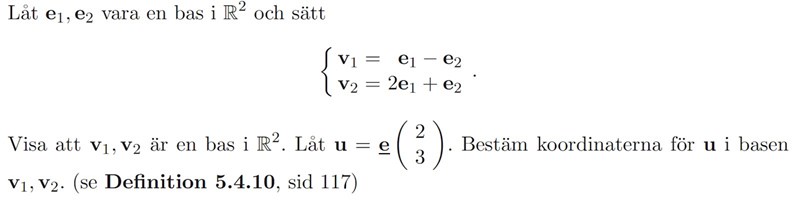 Jag har redan visat att v1 och v2 är en bas i R2. Men behöver hjälp med den andra biten, alltså att bestämma koordinaterna för u i basen v1 och v2.