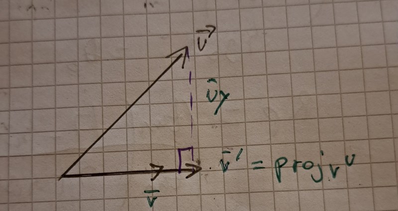 Man kan dela upp u vektorn i x och y komponenter. Vi ser att projv(u) är x-komponenten till u. v' och uy är vinkelräta mot varandra.