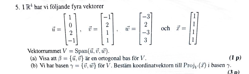 Jag körde fast på 5b) pga hur jag ska bestämma ProjV(x) då V spänner upp u, v och w medan y är en bas i V så hela frågan känns invecklad på något sätt.