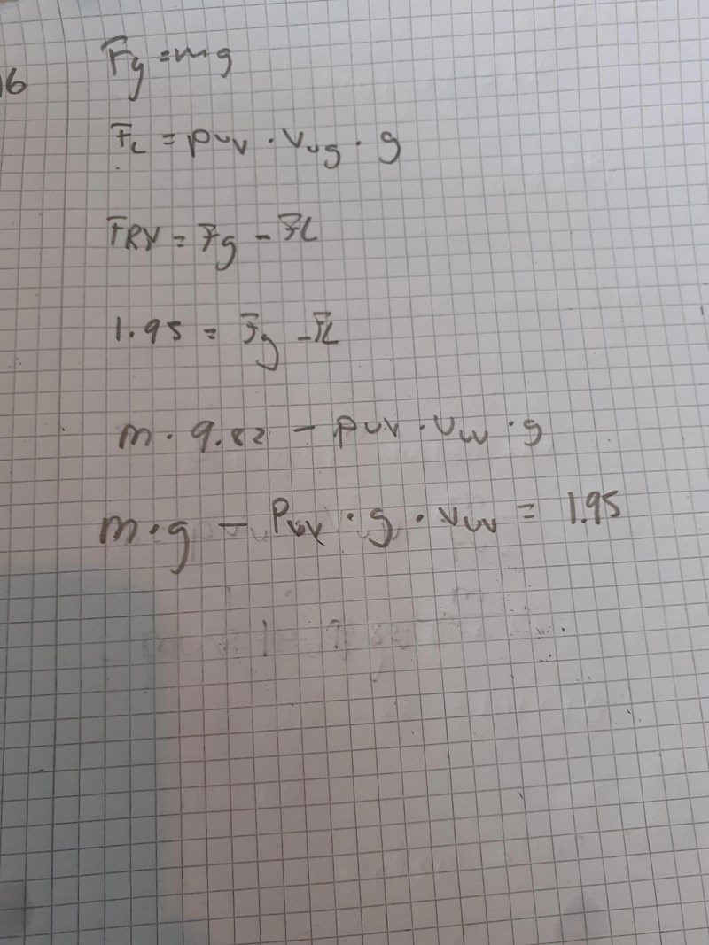 Vad betyder dina beteckningar? Vissa kan jag gissa - som att Fg är gravitationskraften och FL är lyftkraften - men vad betyder ug i vug (som jag gissar är en volym)? Du behöver ta reda på densiteten för både vatten och koppar för att kunna lösa uppgiften.