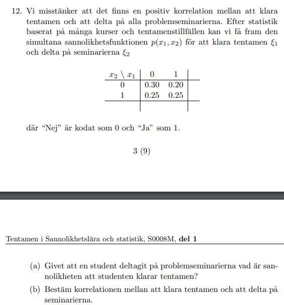 Bestäm korrelationen mellan att klara tentamen och att delta på seminarierna