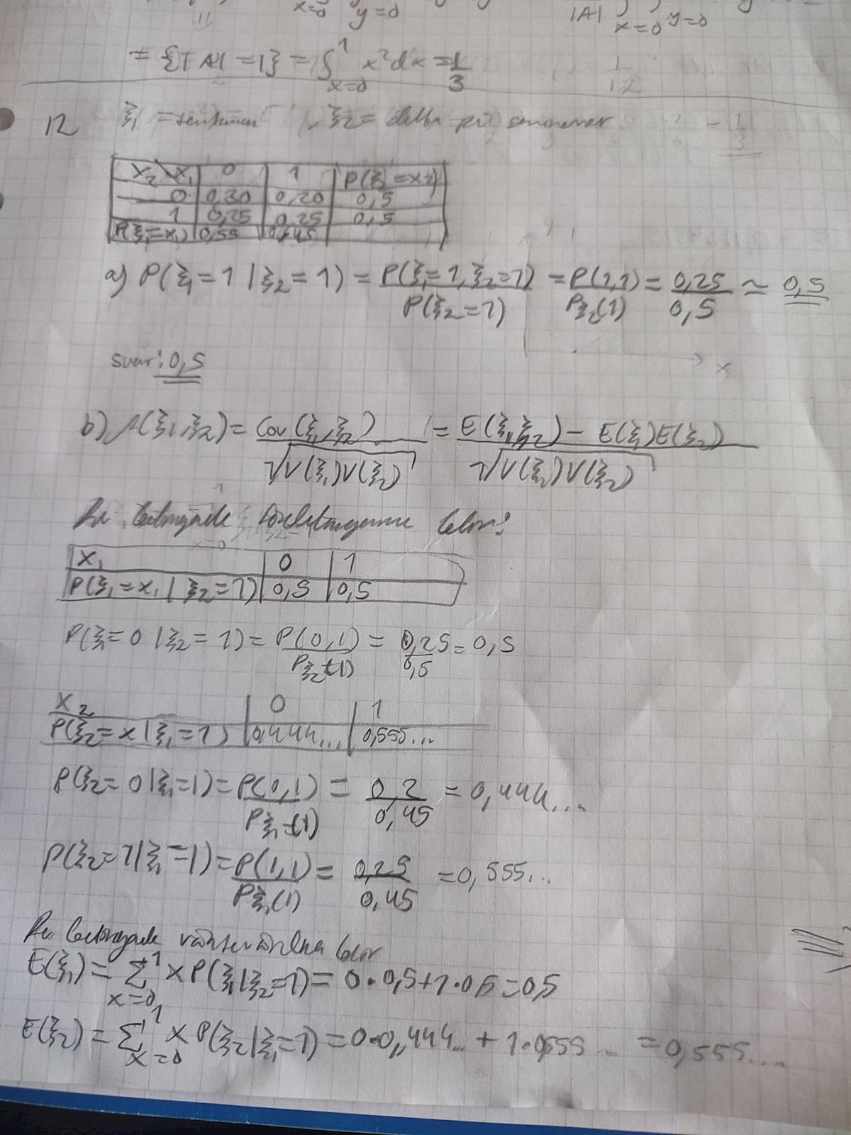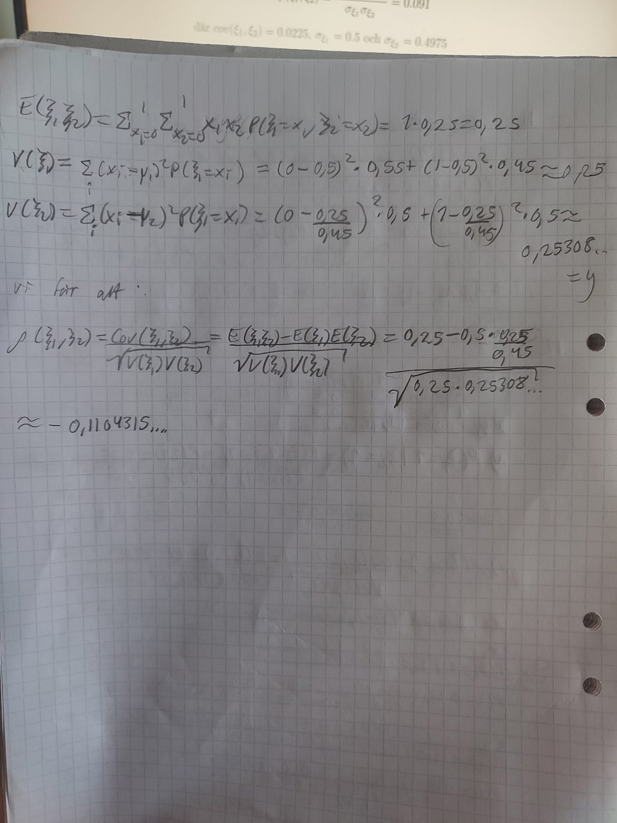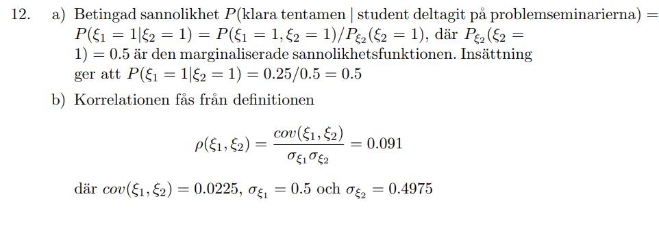 Jag försökte lösa denna uppgift, a)-uppgiften gick bra men på b) har jag fått fel svar och jag ser att de fått andra standardavvikelser och covarians än vad jag har så det verkar som jag gjort fel på detta. Jag har dock försökt att dubbelkolla och dubbelräkna men ser ändå inte vad jag gör för fel när jag tar fram dessa värden:(