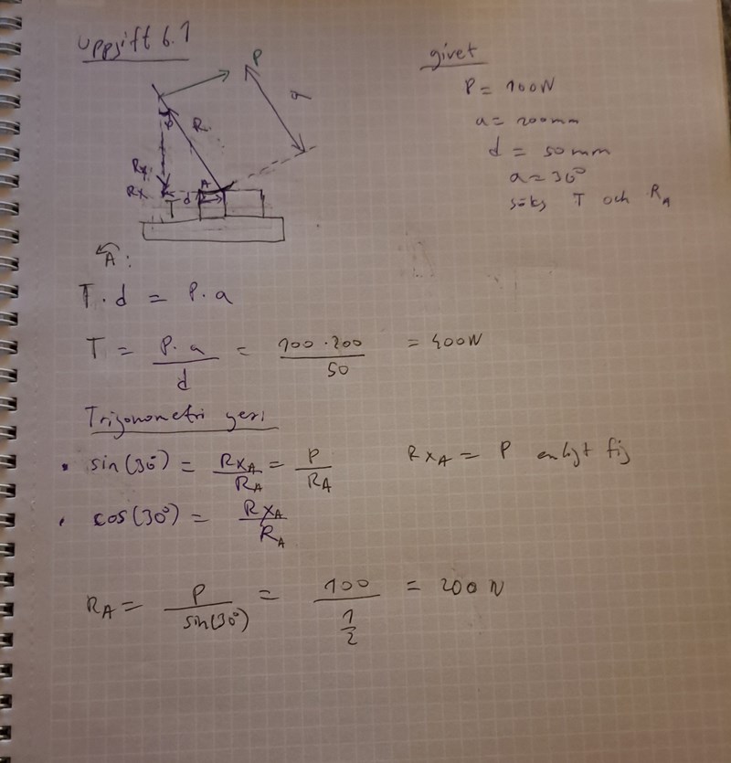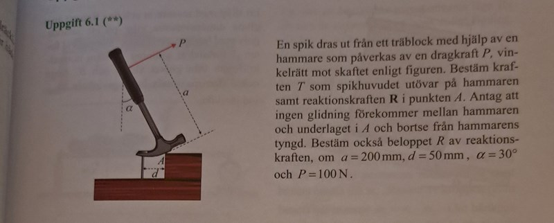 Ja Rx är reaktionskraftens x-komposant  för punkten A. Jag menar dock Rx i A och inte R*x*a.   Som sagt jag trodde punkten A påverkades av en kraft snett uppåt ,men jag kikade på lösningsförslag och det verkar som att man ska tänka på kraft och motkraft dvs hammaren påverkar den där bruna saken med en kraft nedåt och i punkten A blir det en motkraft uppåt, problemet är att de även säger att vi har en reaktionskraft i x-led åt höger som jag inte förstår var det kommer ifrån. Sen säger de att kraften T är riktad nedåt trots att den kraften som spikhuvud utövar på hammaren är uppåt. Gällande kraften P kan man flytta den längs sin verkningslinjen så den hamnar nära A åt samma håll och då bildas det komposanterna Px och Py enligt trigonometri.