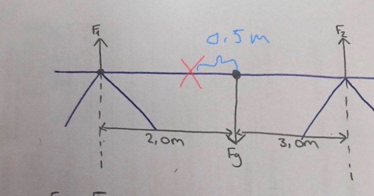 Då kommer Fg att ha en momentarm motsvarande 0,5 meter, medan F1:s momentarm minskar med 0,5 meter och F2:s momentarm ökar med lika mycket. F1 och Fg vill vrida brädan medurs medan F2 vill vrida den moturs. Då blir momentekvationen istället: