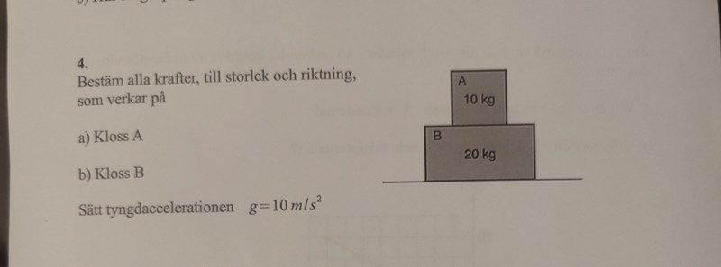 På klossen A verkar tyngdkraften 10*10 =100 N nedåt. För att den ska förbli i vila, ej accelerera, krävs en uppåtriktad lika stor kraft, kontaktkraften mellan A och B, 100N.