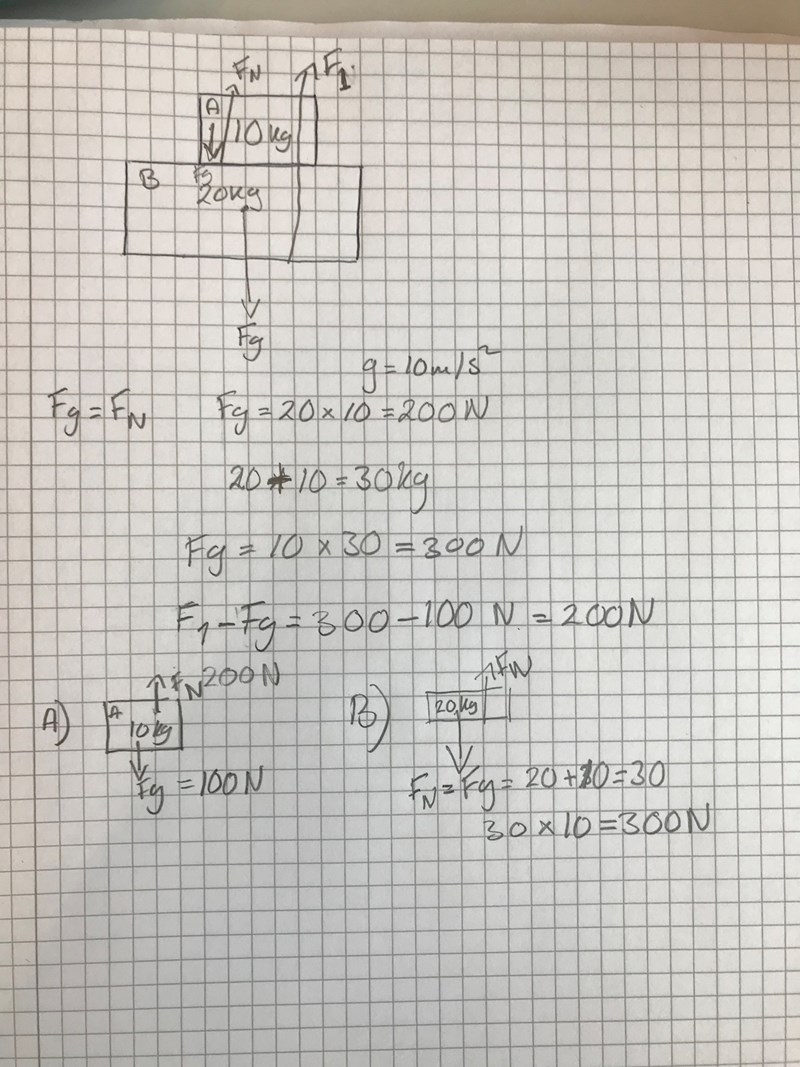 På klossen B verkar tyngdkraften 20*10 = 200 N nedåt samt (kontakt)kraften från A 100 N nedåt.