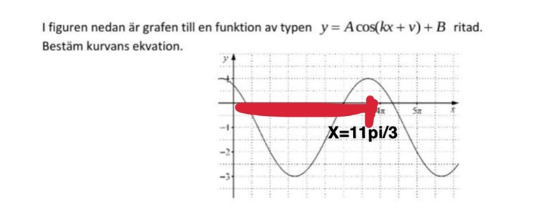 cos(0)=1 betyder att maxvärdet av kurvan uppnås då argumentet till cos() är 0. Du ska alltså hitta x-värdet där kurvan har ett maxima. Lite svårt att läsa av i grafen men ser ut som max vid 3 2/3 pi = 11/3 pi.