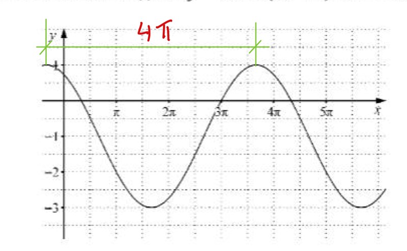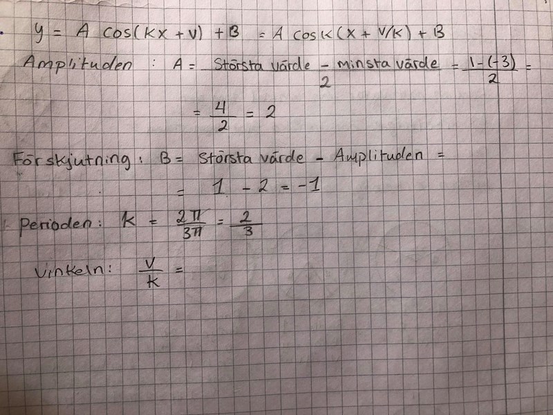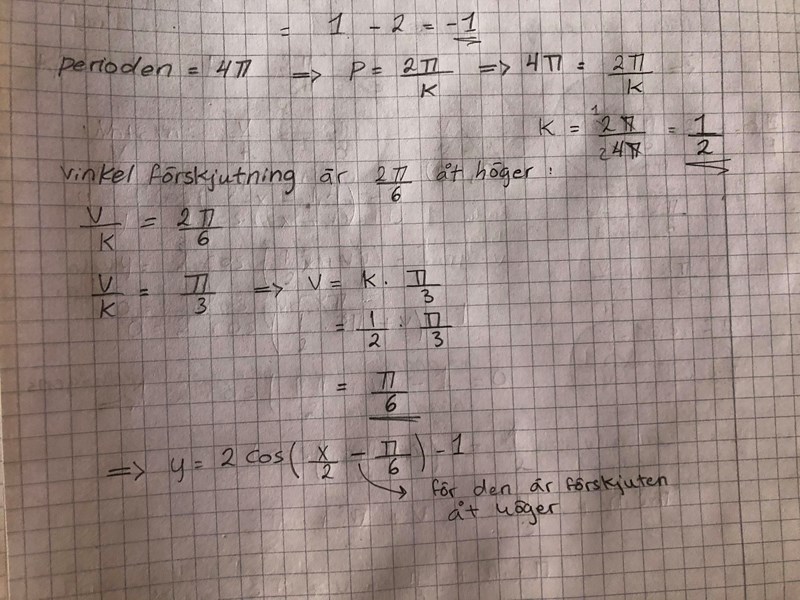 Jag har dragit en rätt linje som presenterar Förskjutningen B = -1 och försökte läsa på den när kurvan har gjort en halv varv för att bestämma perioden och då läste jag värdet till 3π. Men tror jag har tänkt fel.
