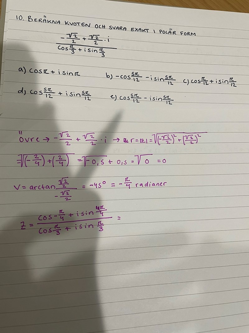 Såhär har jag börjat med förstår inte hur jag ska gå vidare nu. Jag antar att jag kan börja med att skriva om täljaren till polär form eftersom nämnaren redan är skriven i det?