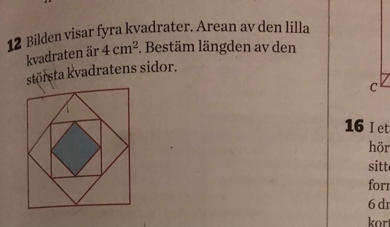 Uppgiften nedan förstår jag inte. Hur ska jag kunna få reda på den längden när jag bara har arean på den minsta kvadraten?