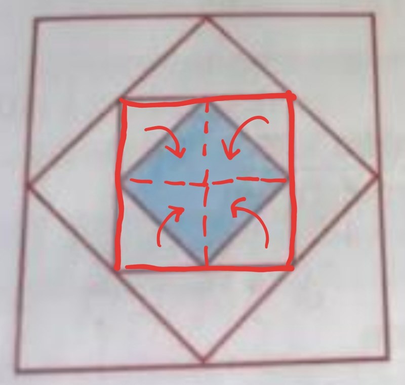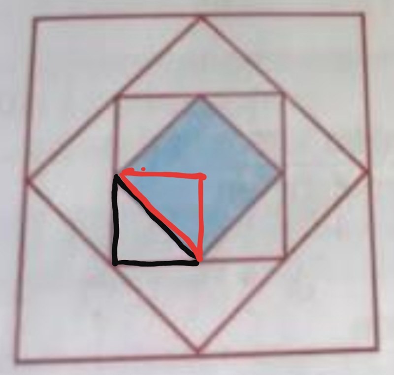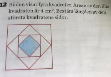 den lilla kvadraten har arean , vi vet att en kvadrats area beräkans som . detta betyder att längden på en sida av kvadraten kan beräknas från . Den lilla kvadratens diagonal är längden på basen / höjden för den större kvadraten som innehåller den mindre kvadraten, denna kan du beräkna med pythagoras sats. Nu kan du stegvis röra dig ut från mitten för att slutligen beräkna längden för kvadratens sidor.