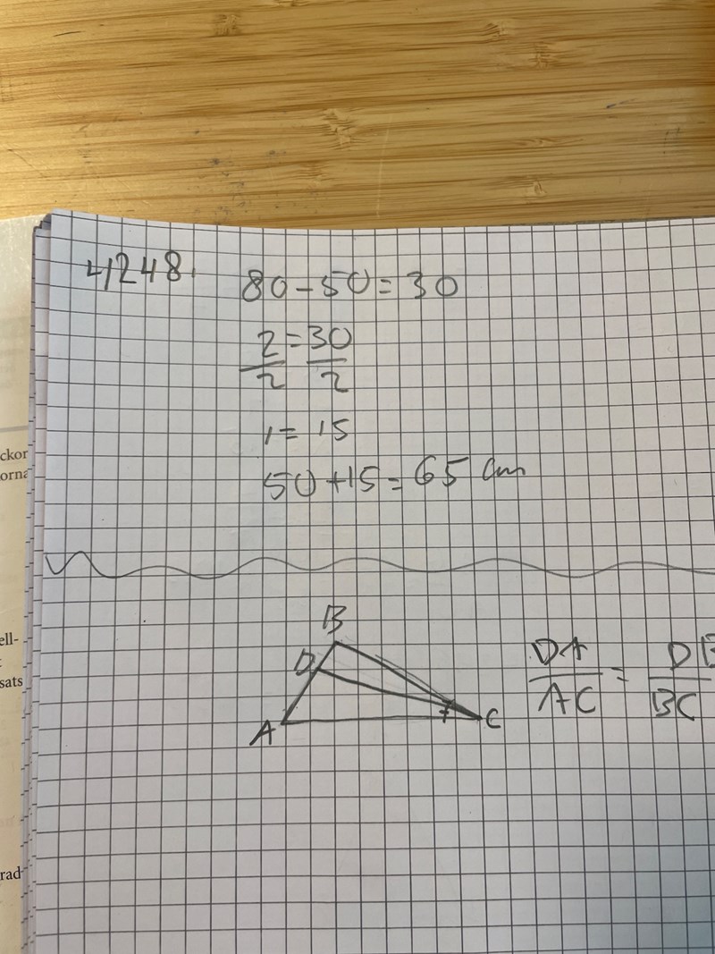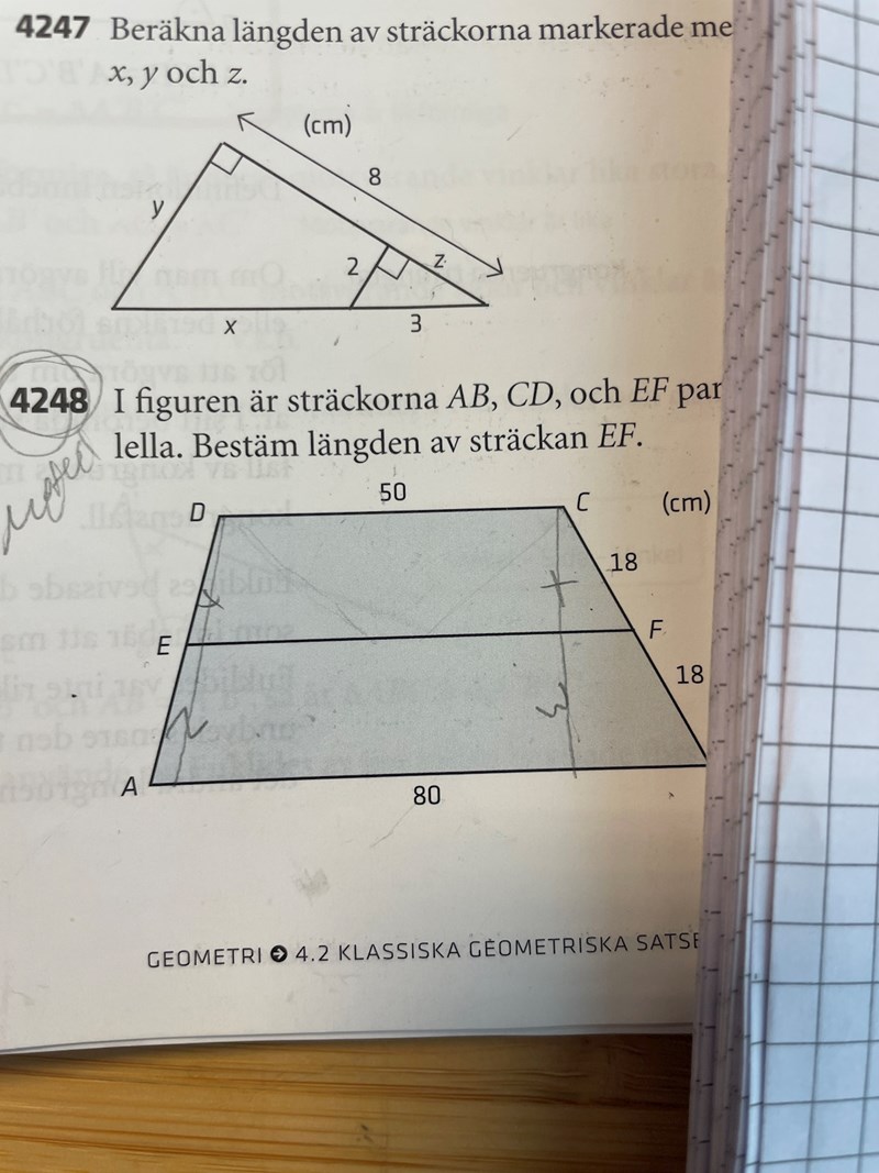Man kan se att EF ligger halvvägs mellan båda parallella sidor, så ja det blir medelvärdet av 50 och 80. Det är i så fall bättre att svara det i text än att skriva saker som bara inte stämmer.