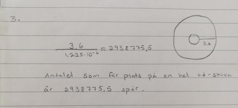 3. Skivan var sannolikt "inspelad". Då hade ni kunnat notera var innersta och yttersta spåret fanns. Måttet 3.6 är väl 3.6*10-2m och är då något för stort. Öva på hur man skriver tal med tiopotenser t.ex. 2.94*104