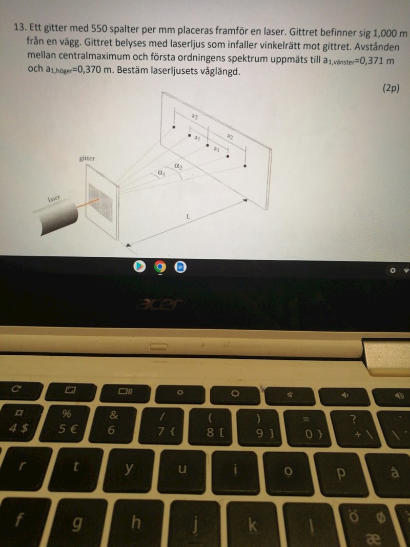Fick det till 36 grader. Använde tangens typ och la ihop a1 vänster och höger. Men jag kanske borde ha räknat med a1 höger bara då blir vinkeln 1=20,3044 grader och lambda blir typ 6,3092...*10^-7 m