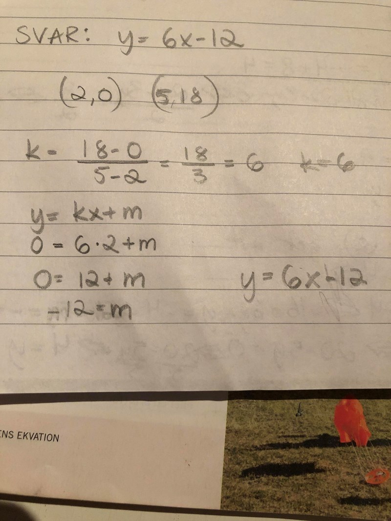 Trianglar får se ut så. Du ska nu bestämma ekvationen för linjen som går genom (2,0) och (5,18).