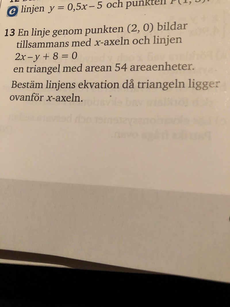 Om du börjar först med att ställa upp all information du har kan du enklare se hur allt ska hänga ihop för att en triangel med 54 areaenheter skall kunna bildas. Så börja med att rita ett koordinatsystem och markera punkten (2,0) samt ena linjen. Två av triangels sidor är x-axeln samt linjen y = 2x + 8. Hur kan man hitta den sista sidan?